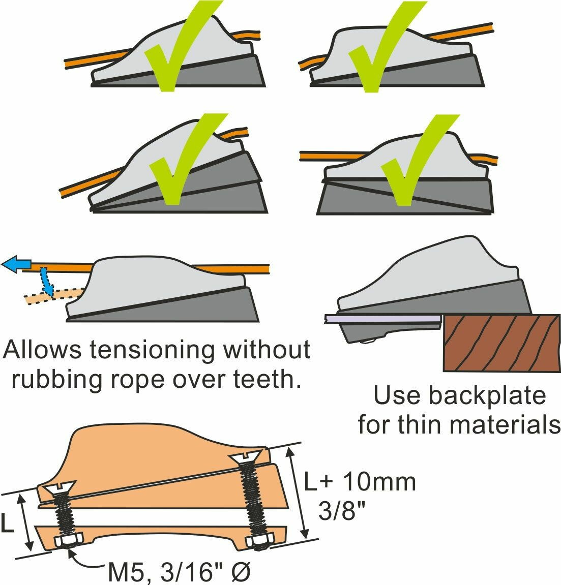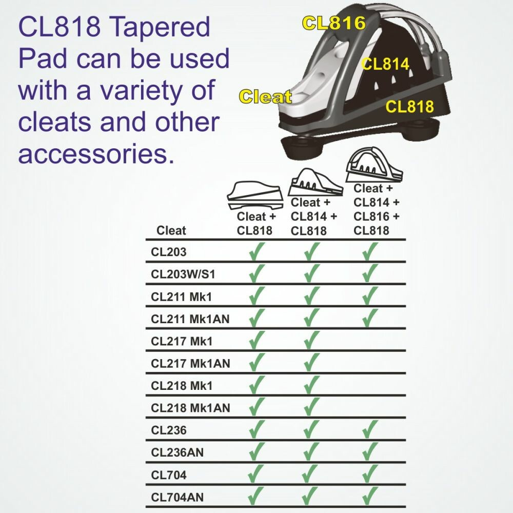 Tapered Pad Clamcleat® CL818 napomáhá správnému vyrovnání lana/záseku. Umožňuje napínání bez tření lana o zuby zarážky. Podložku lze namontovat oboustranně.