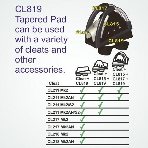 Podložka Clamcleat CL819 se používá s těmito záseky Clamcleat: CL211 Mk2, CL211MK2 S2, CL217 Mk2, CL218 Mk2 plus verze s tvrdým eloxem. Používejte také s nylonem CL272
