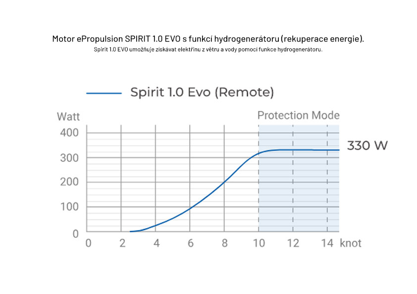 Vyšší výkon nové generace elektromotoru ePropulsion SPIRIT 1.0 EVO se vyznačuje vylepšenou konstrukcí bez převodů. Díky vysoce kvalitnímu elektromotoru s kapalinovým chlazením a max. účinností 90% dosahuje ePropulsion SPIRIT 1.0 EVO celkové účinnosti přes 55%. Motor nevyžaduje údržbu. V případě jakékoliv překážky pod vodou čidlo automaticky sníží otáčky nebo se motor okamžitě zastaví.