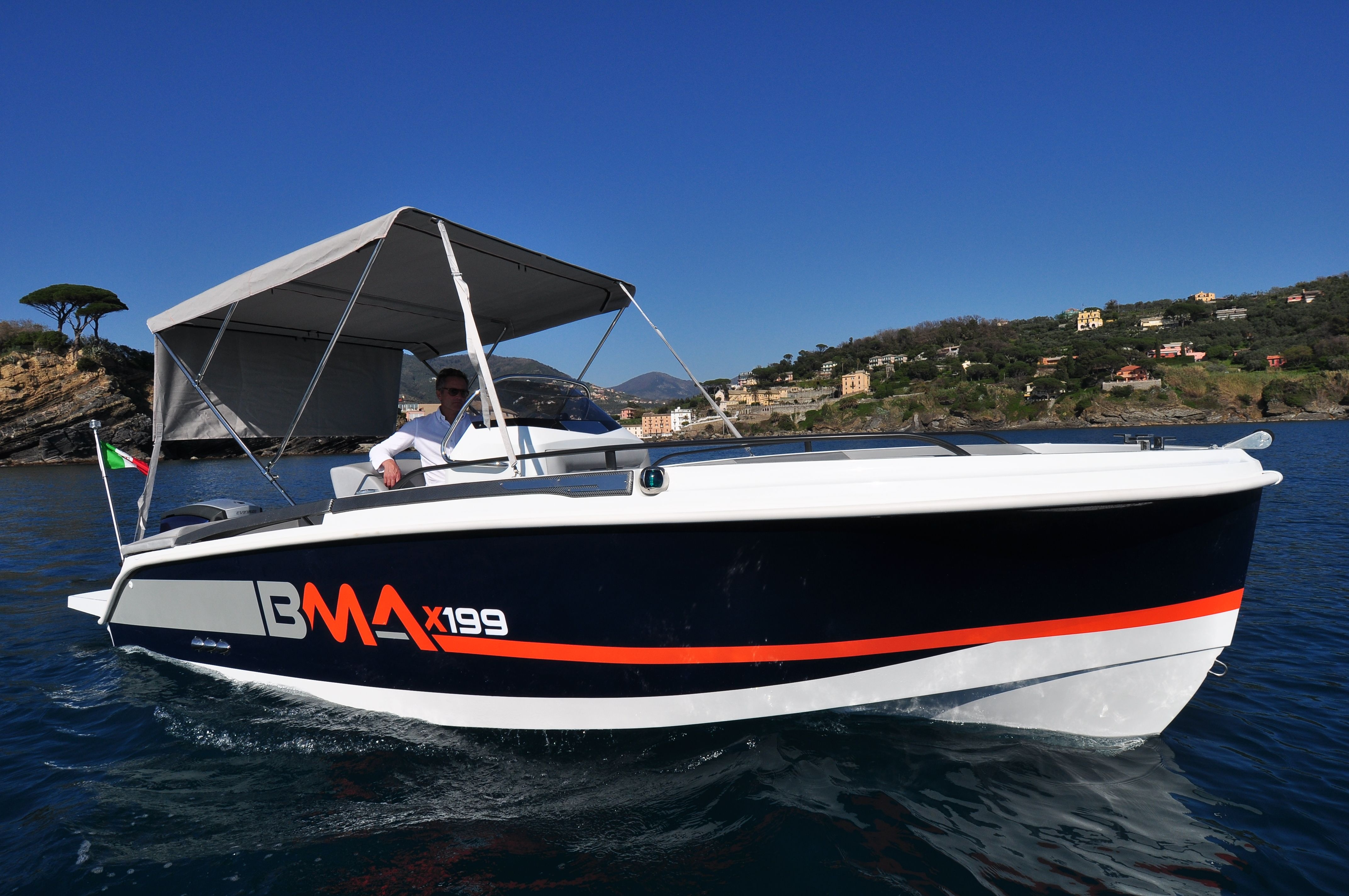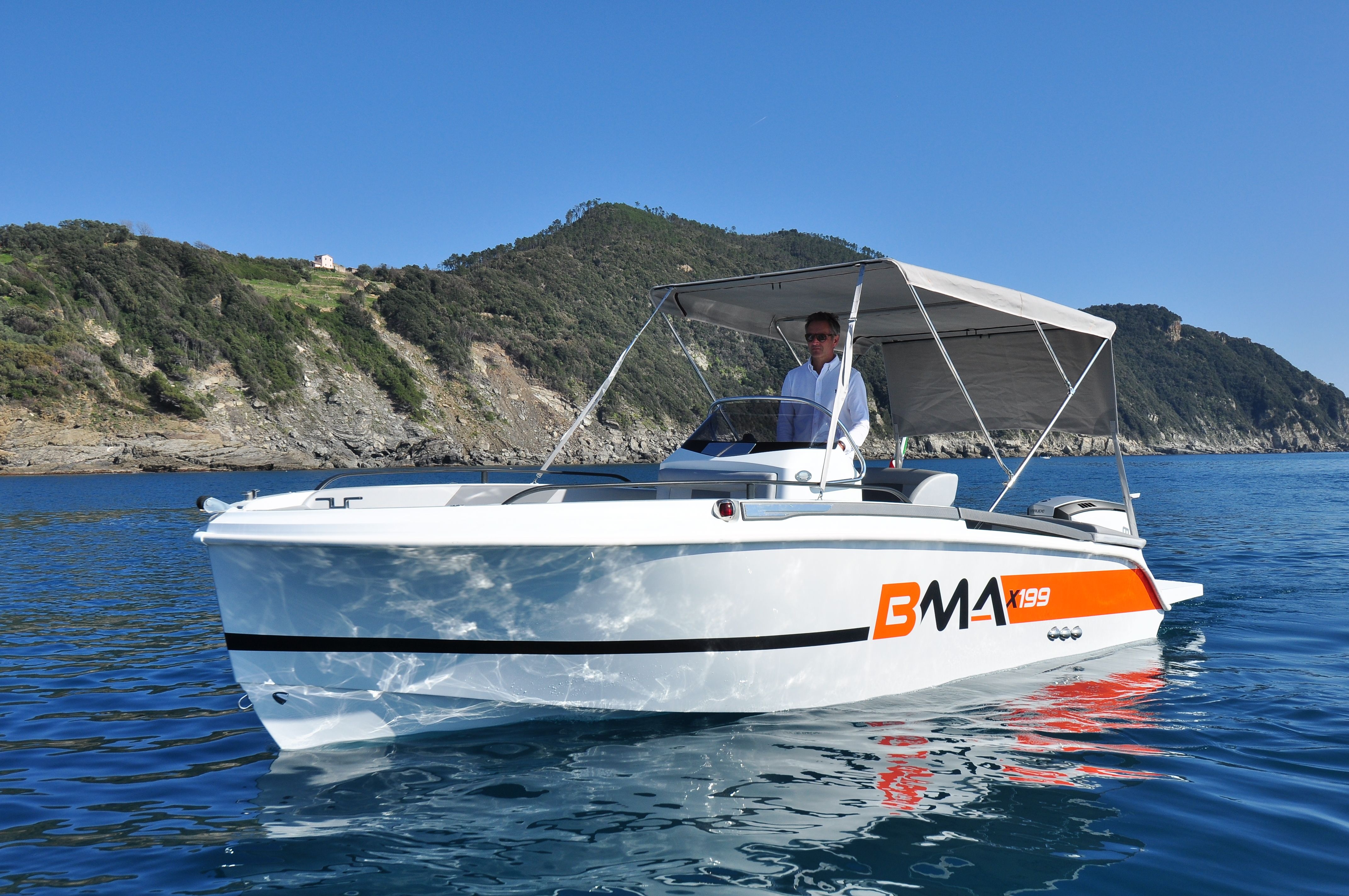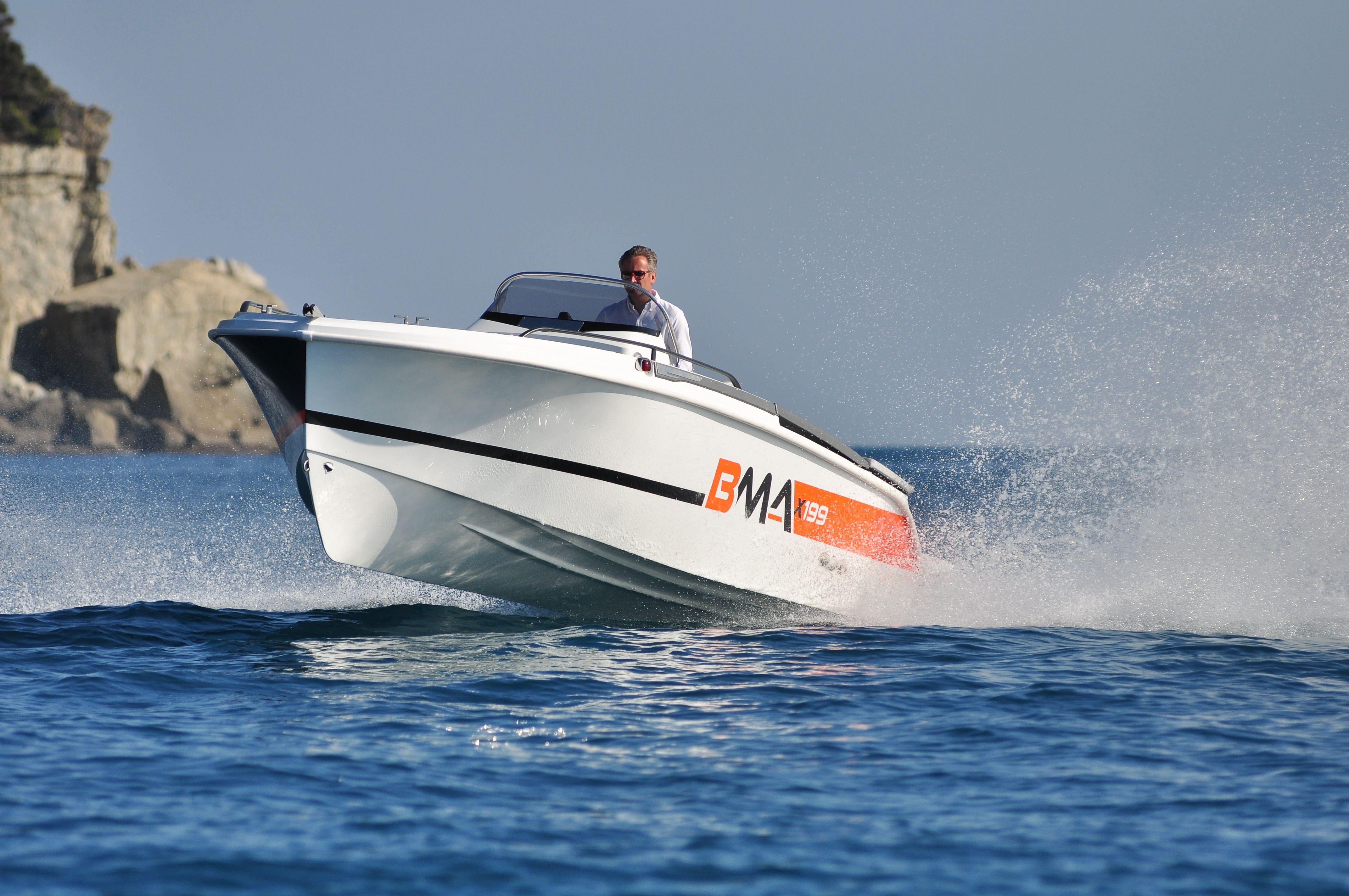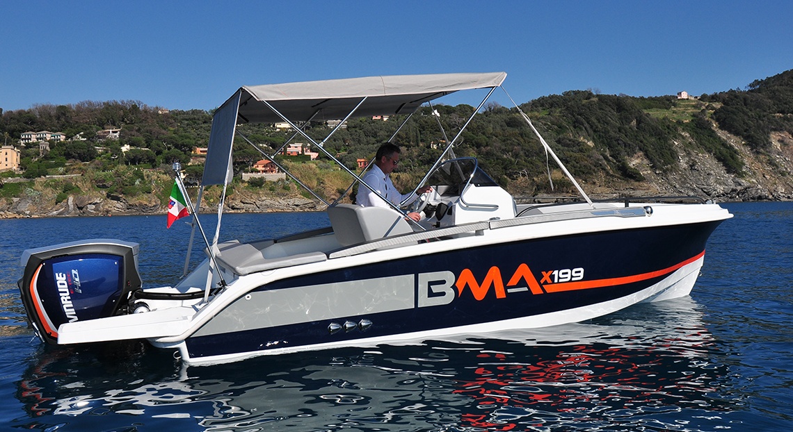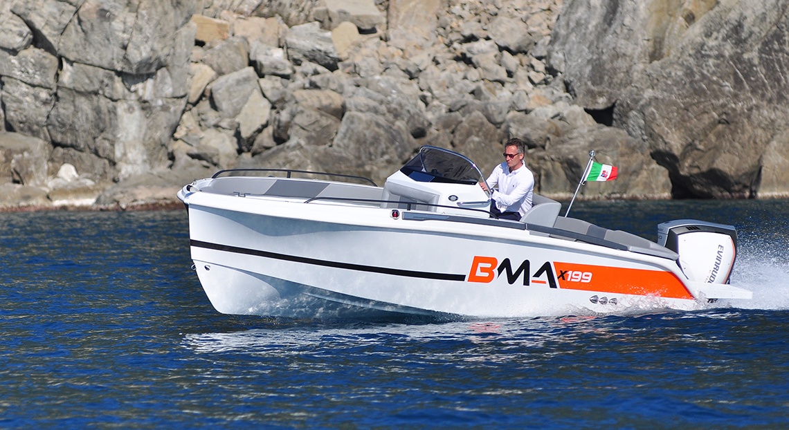 Do standardní výbavy motorového člunu BMA X199 Open patří konzole se sedadlem, sportovní sedadlo řidiče, volant a čalounění, nerezové kování, palivová nádrž 90 L, navigační světla, automatická bilge pumpa, bateriový odpojovač, pumpa, žebřík.
