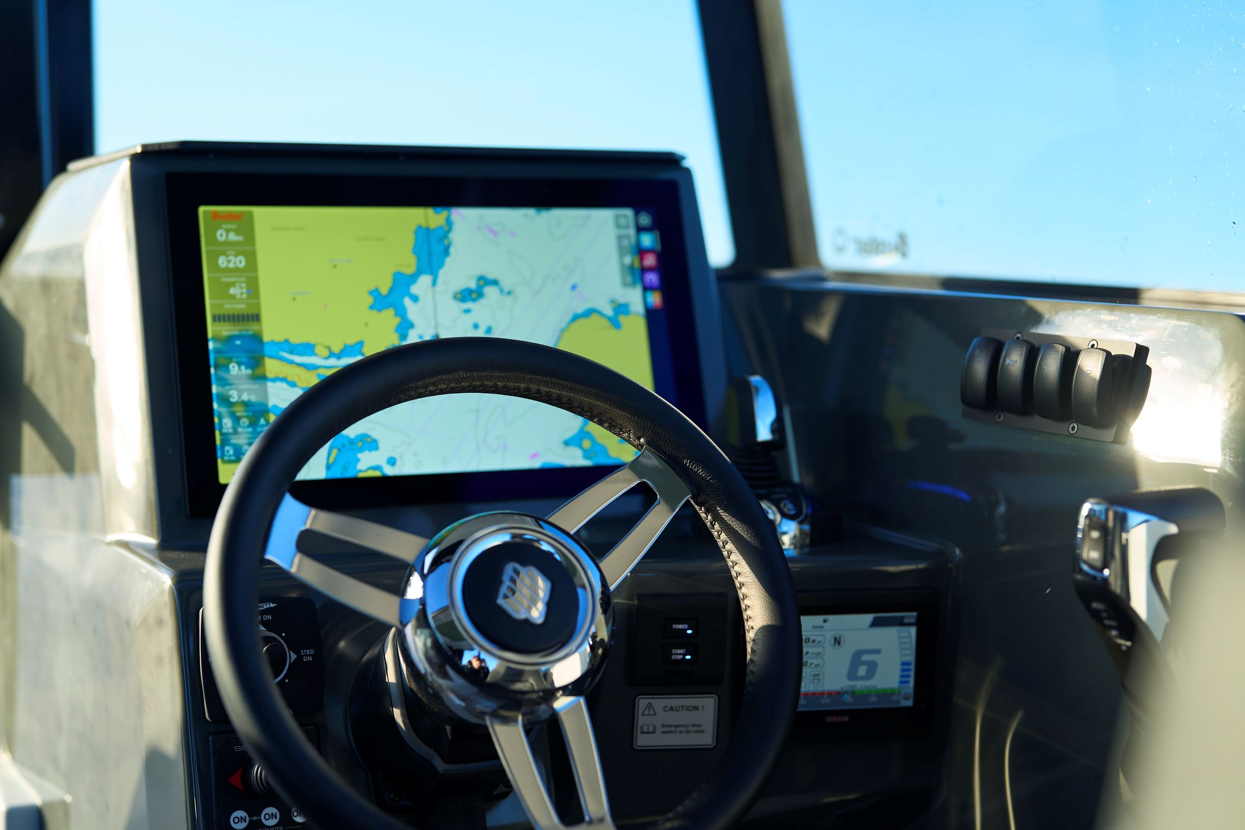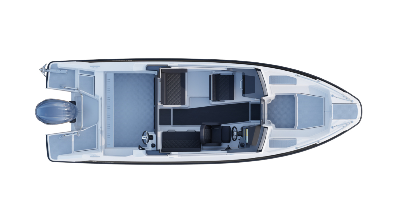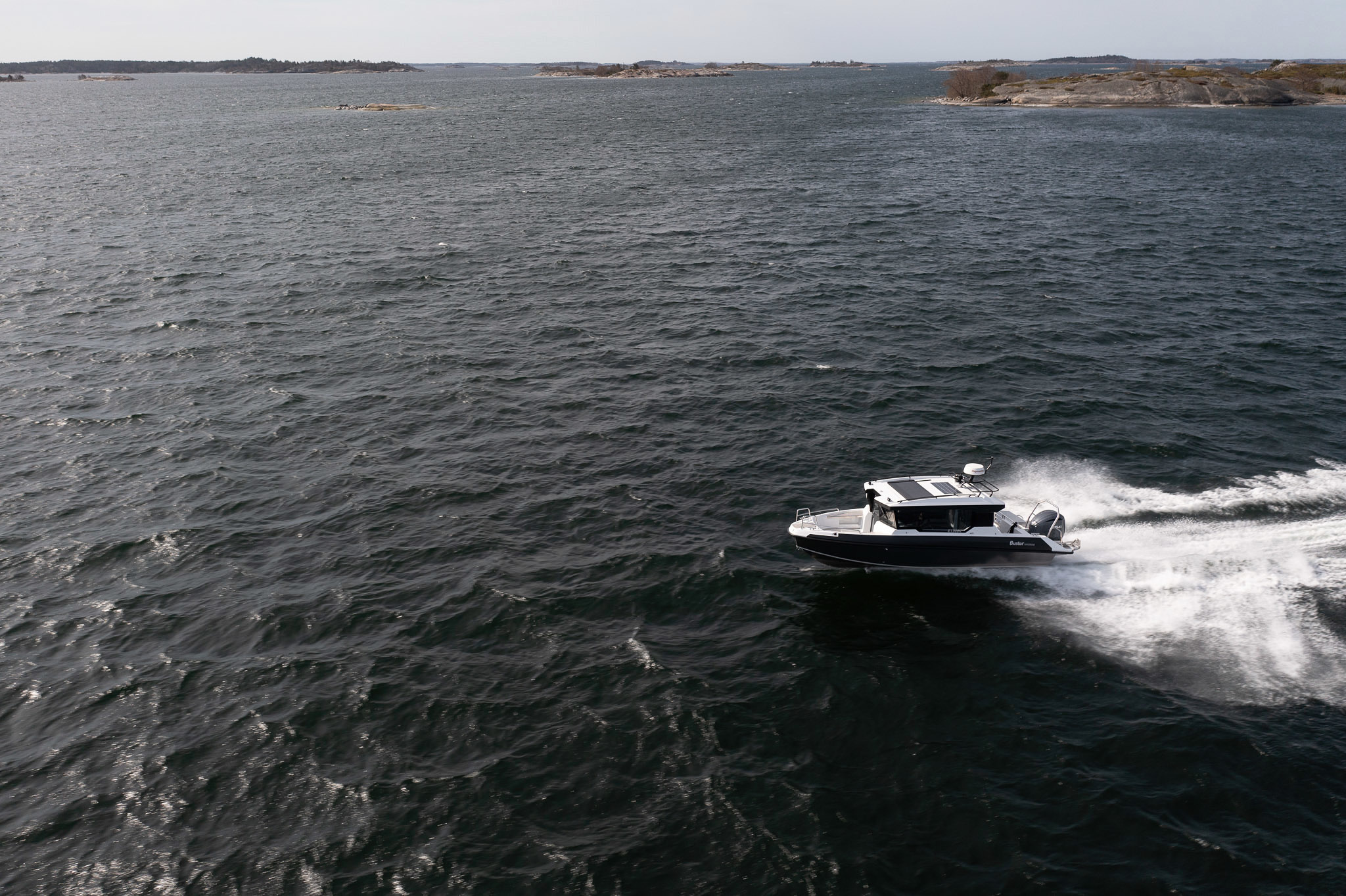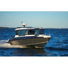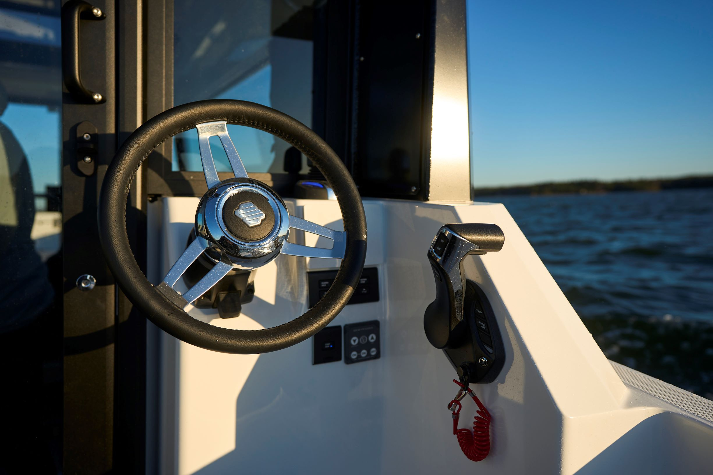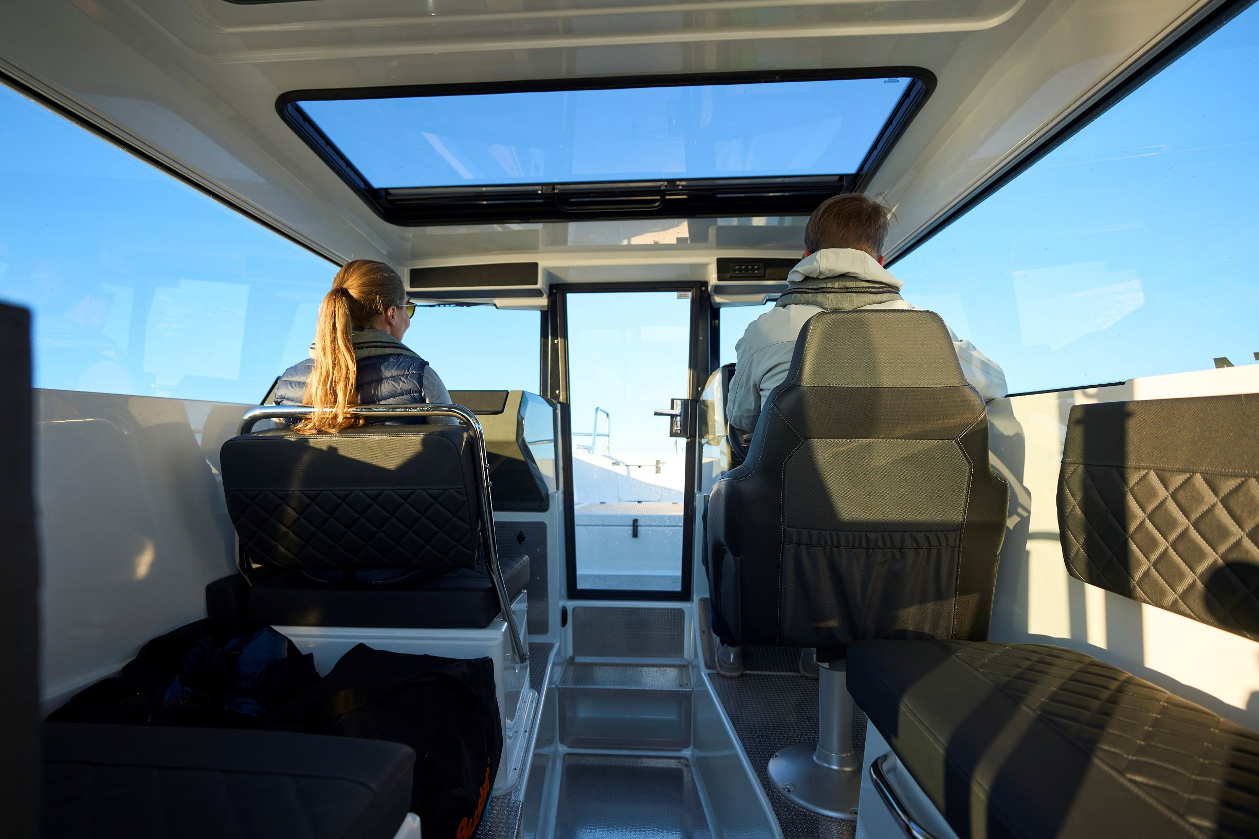 Kabina se vyznačuje průchozím designem, kromě toho je příď přístupná ze zádi vně podél pravé strany kabiny. Nastupování na loď je snadné díky prostorným přístupovým plochám a robustnímu zábradlí na přídi i zádi. Povrchy podlah uvnitř i vně jsou pokryty protiskluzovým vzorovaným hliníkovým plechem. Dvojité zábradlí usnadňují přístup z přídě, zatímco široká plavecká plošina, která sahá daleko na stranu přívěsného motoru, je snadno přístupná ze schůdků v pravém rohu zadní paluby. Kabina má šest míst k sezení a v krytém zadním kokpitu jsou k dispozici skládací lavice pro dva. Kokpit může být také vybaven volitelným venkovním kormidelním stanovištěm. Standardní výbava zahrnuje 16" chytrý displej Buster Q.