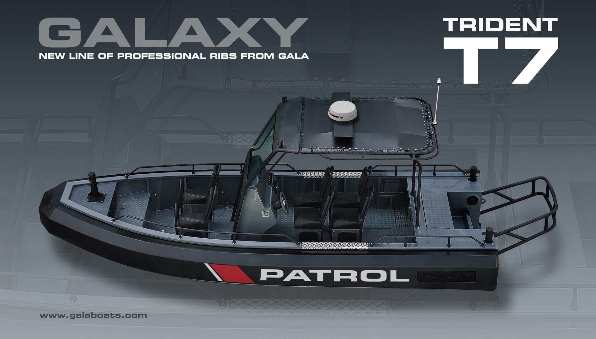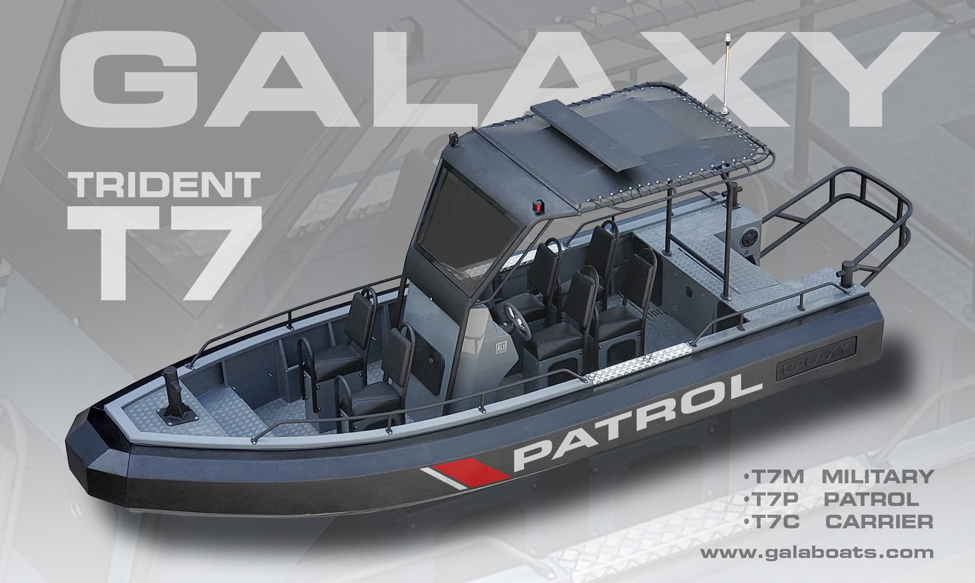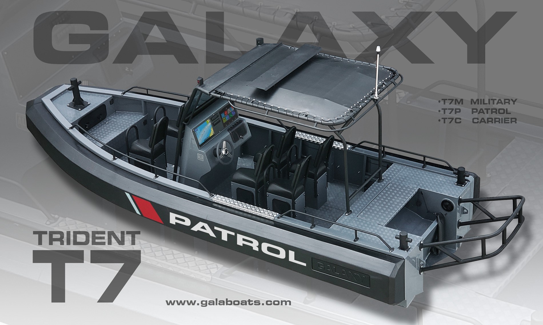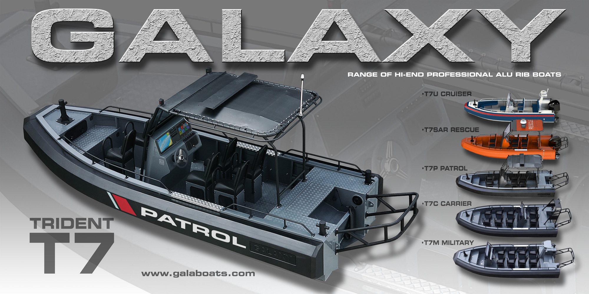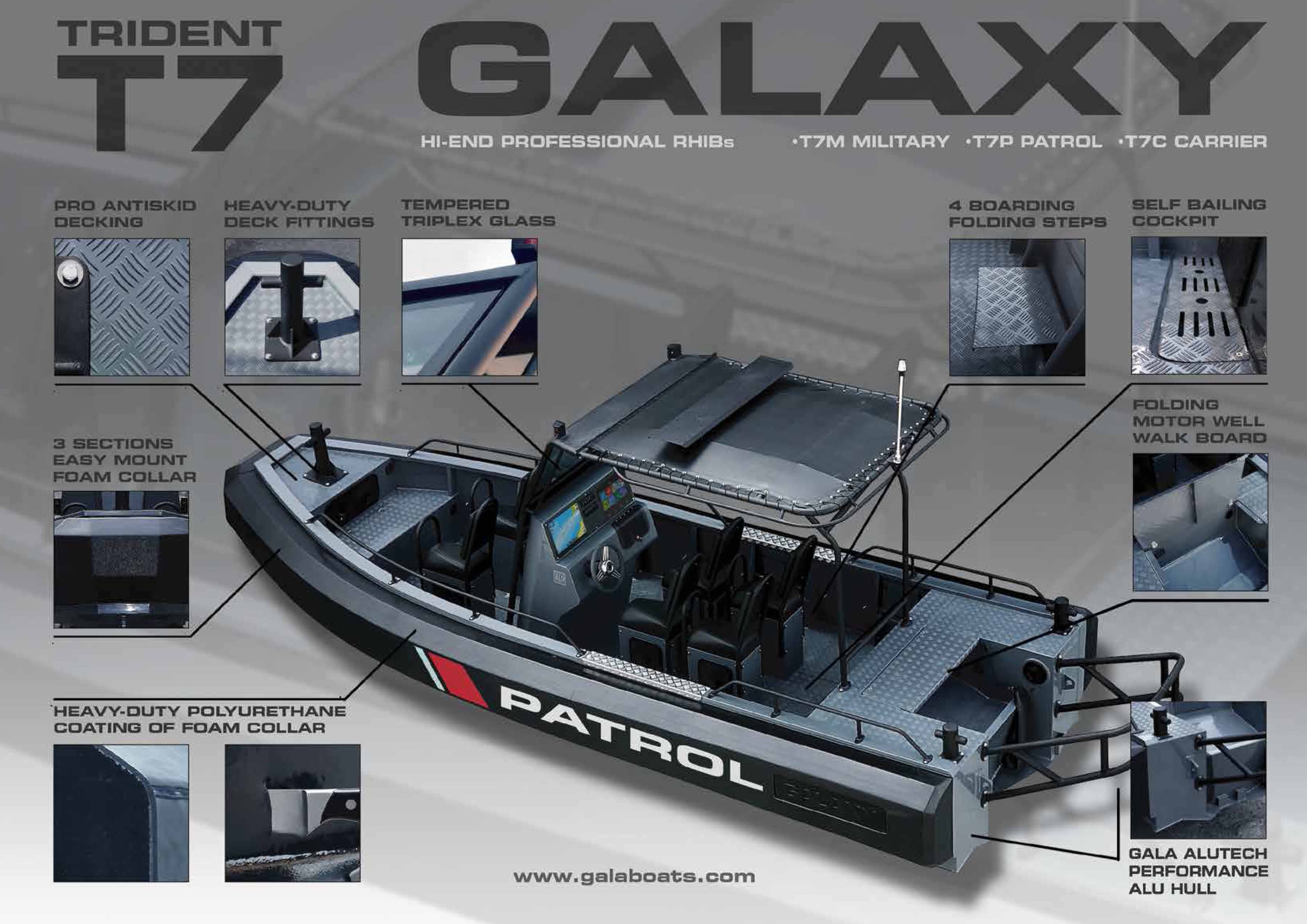 TRIDENT T7 (dříve T650) je jedním z nejikoničtějších a nejinovativnějších člunů společnosti GALAXY. Tato loď je postavena tak, aby splnila náročné požadavky na používání v oblasti vymáhání práva, hlídkování, vojenské a komerční aplikace. Vyznačuje se superpevným svařovaným hliníkovým trupem. Jedinečným rysem je trubka ve tvaru D (D-tube) s vestavěnými komorami pro vztlak, která nabízí výrazně více využitelného prostoru v kokpitu a vynikající odolnost ve srovnání s tradičními RIB s trubkami ve tvaru O.