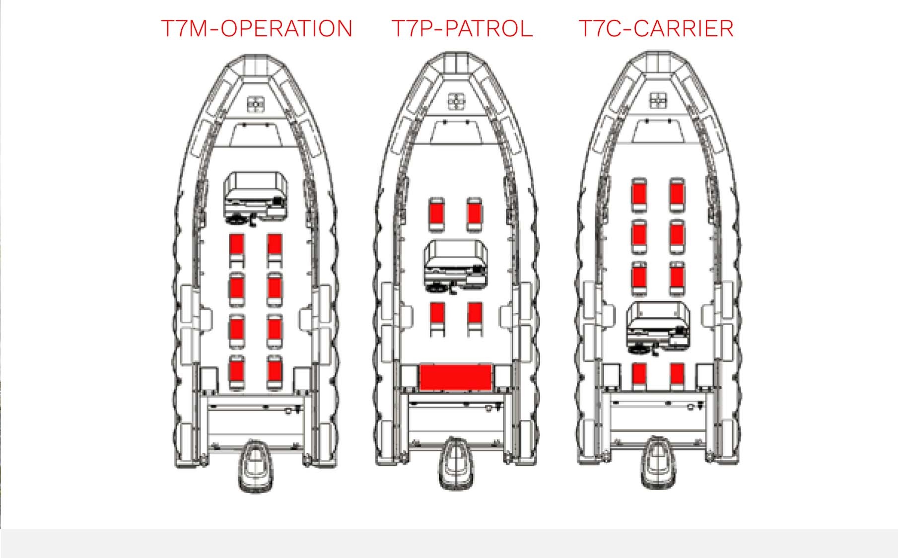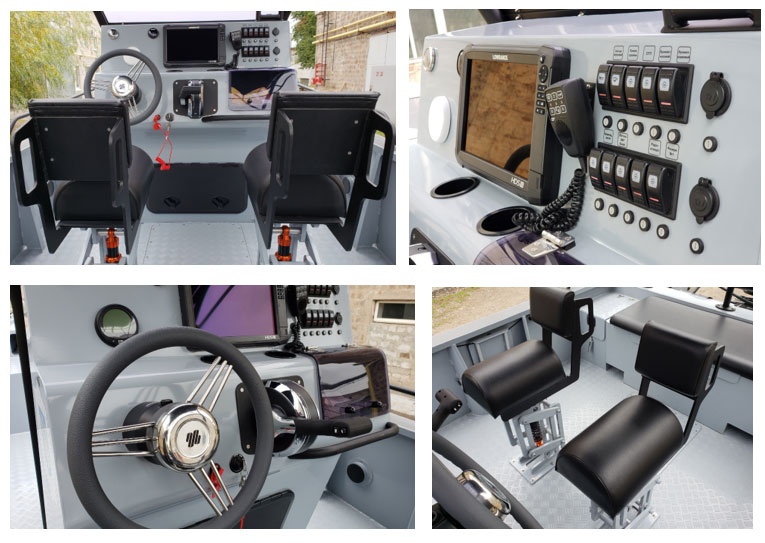 Nabízíme širokou škálu volitelného vybavení paluby, včetně řídicích konzolí, uspořádání sedadel, oblouků, T-topů, střech, ochranných rámů motorů, sloupků, skříněk na munici a mnoho dalšího. Díky této rozsáhlé nabídce možností si můžete svůj TRIDENT T7 přizpůsobit tak, aby dokonale odpovídal vašim specifickým požadavkům na misi. Výsledek: ideální loď pro splnění jedinečných požadavků vaší operace!
