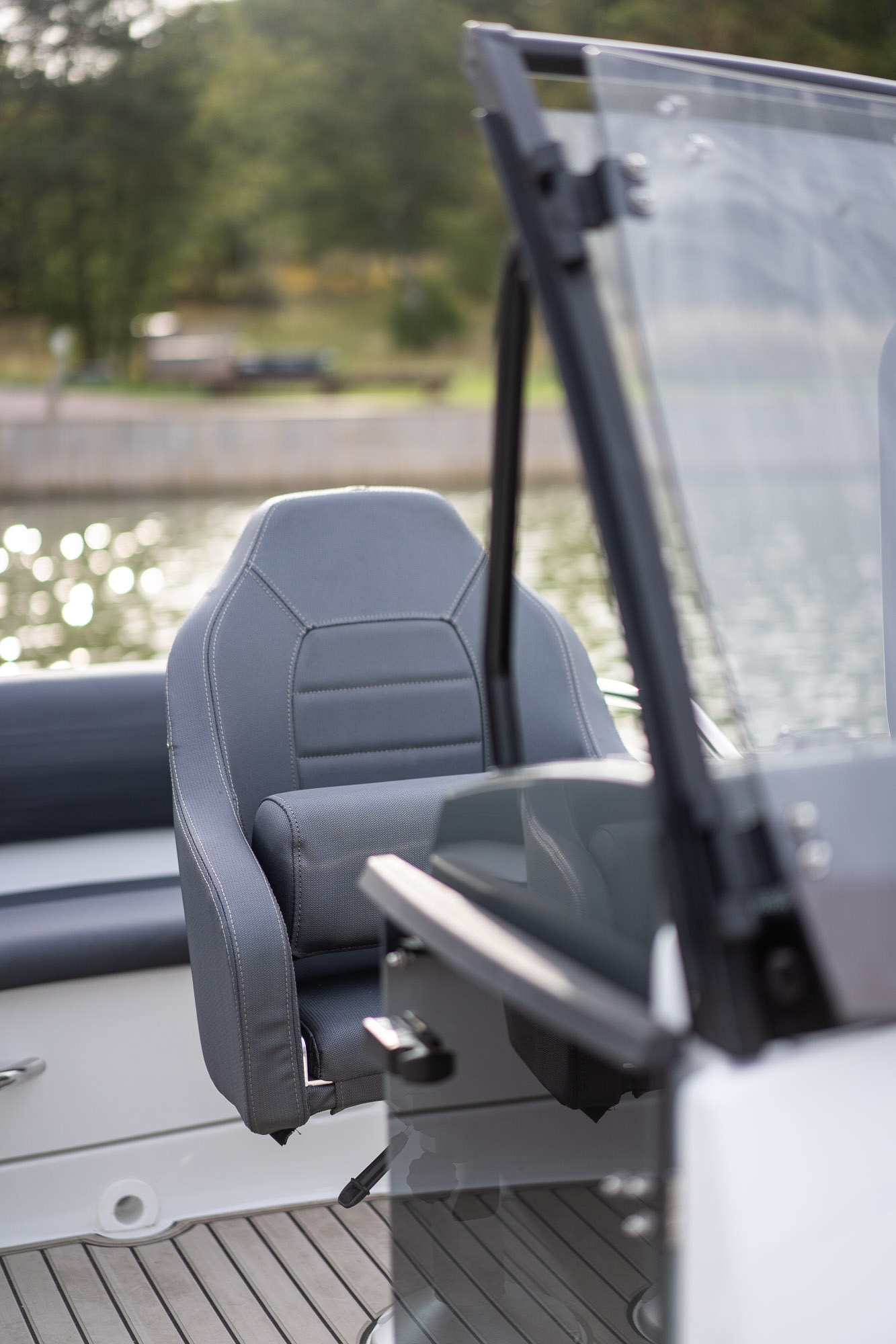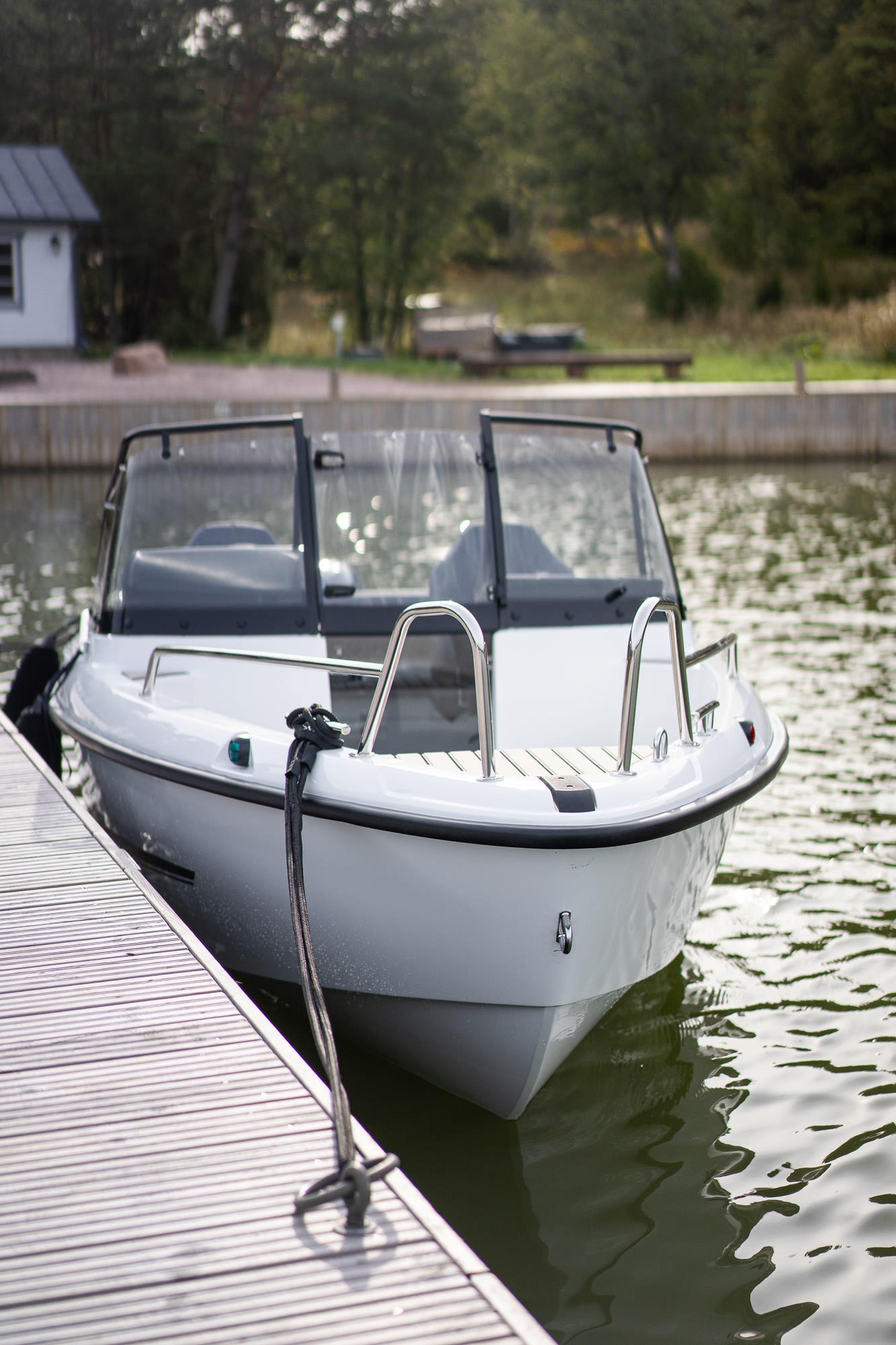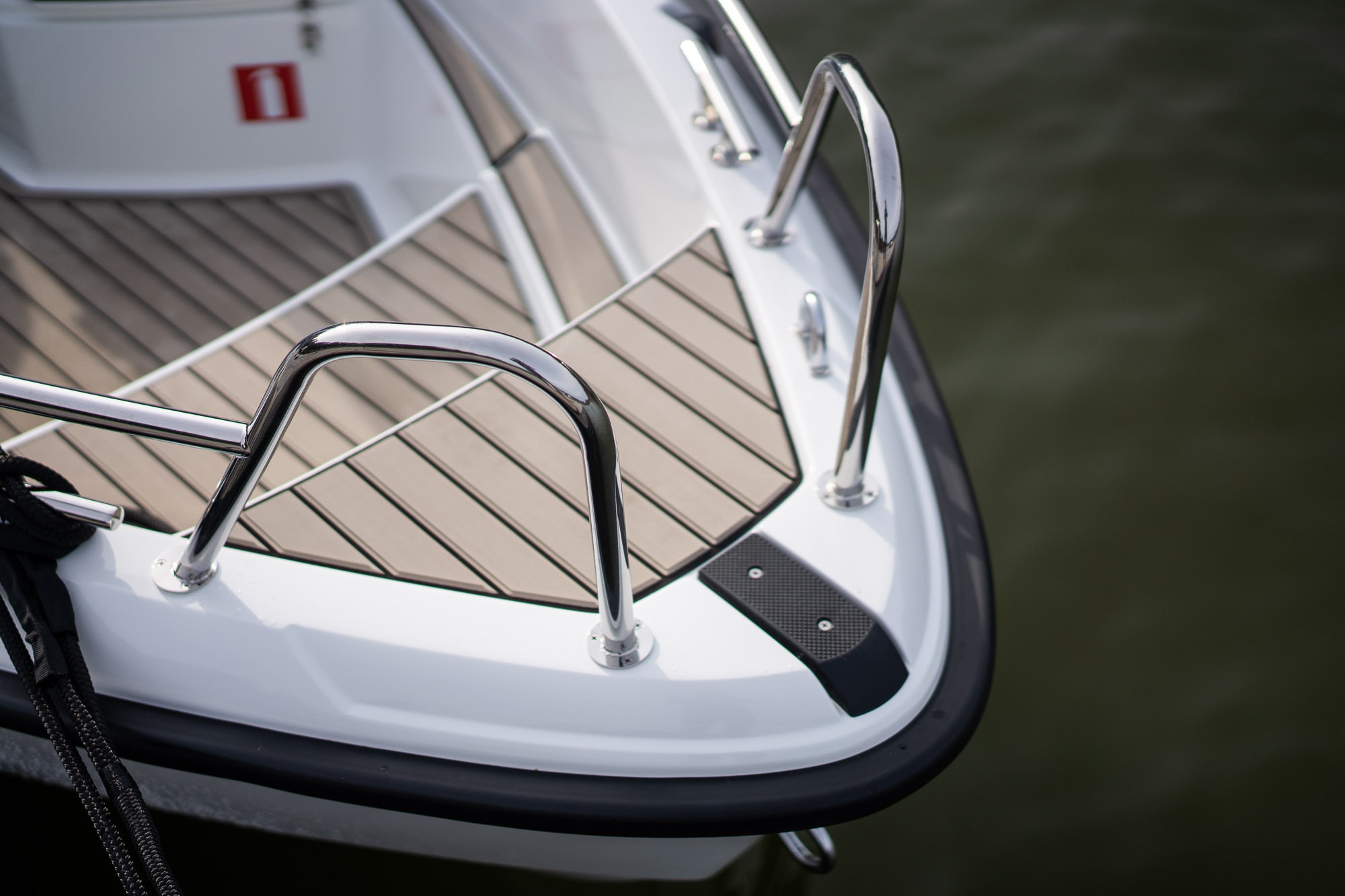 Otevřený prostor je praktický a bezpečný: velké a přehledné povrchy schůdků usnadňují nástup do lodi a pohyb v lodi. Volitelný protiskluzový povrch podlahy Softdeck dále zvyšuje bezpečnost a vzhled, stejně jako stylové a robustní černé zábradlí kolem ochranného čelního skla.