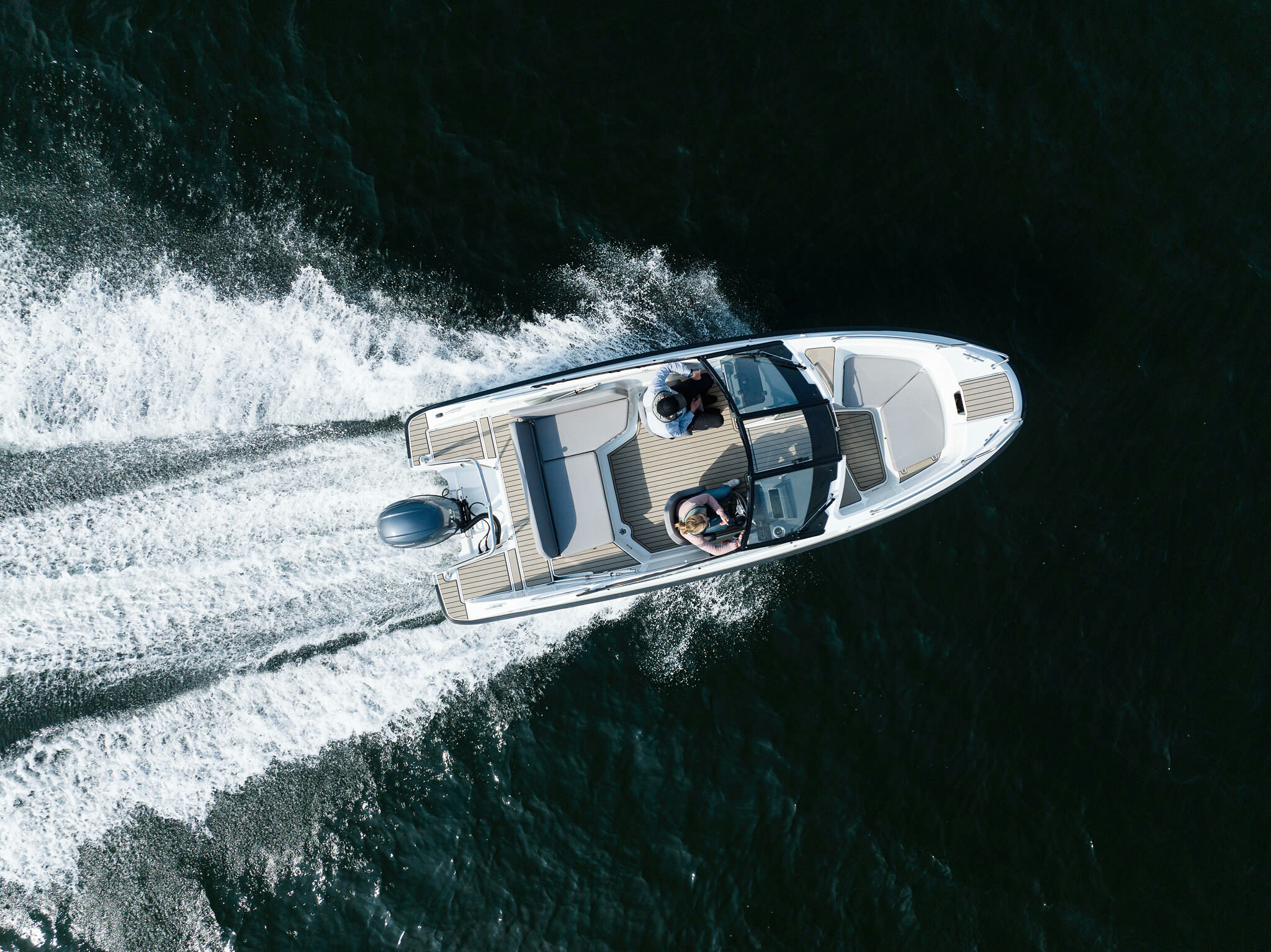 Dobře navržené a umístěné velké schůdky po celé lodi zajišťují, že se lze snadno pohybovat z přídě na záď, a oblouk pro vodní lyžování (příslušenství) slouží jako pevné zábradlí při pohybu na zádi a na koupacích plošinách. Softdeck je standardní vybavení a dotváří stylový celkový vzhled lodi. Otevřená plocha je pečlivě navržena a všechny úložné prostory byly maximalizovány.