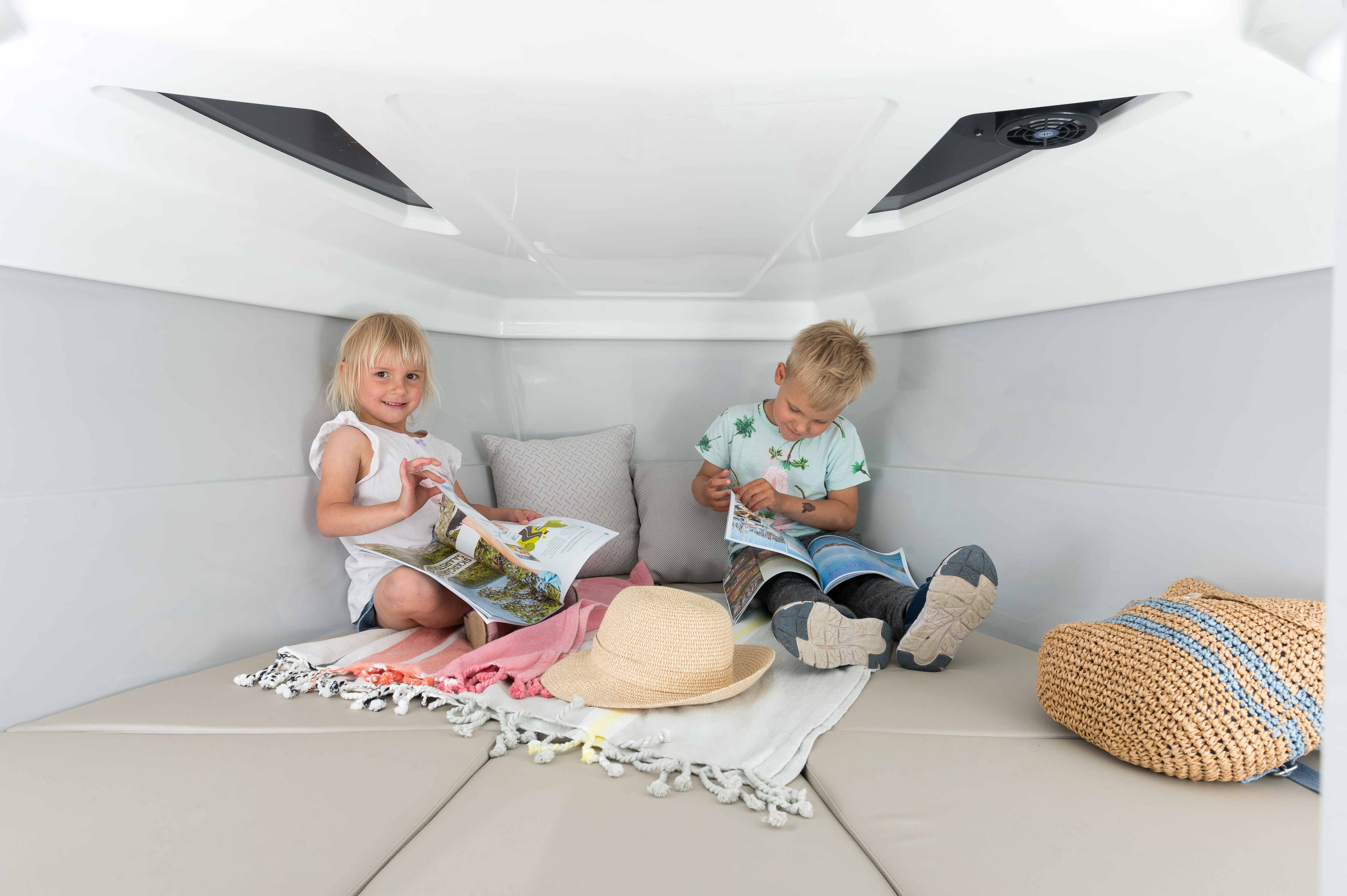Příďová kabina nového modelu Yamarin 63 DC má lůžka pro dva a úložný prostor pro zavazadla. Díky oknům v přídi, stropním oknům v kabině a světlým barvám kabiny působí prostorně. Po dobrém dni na vodě lze loď snadno zakrýt krycí plachtou, která je součástí standardní výbavy lodi. Krycí plachta udržuje loď uklizenou a připravenou na další cestu.