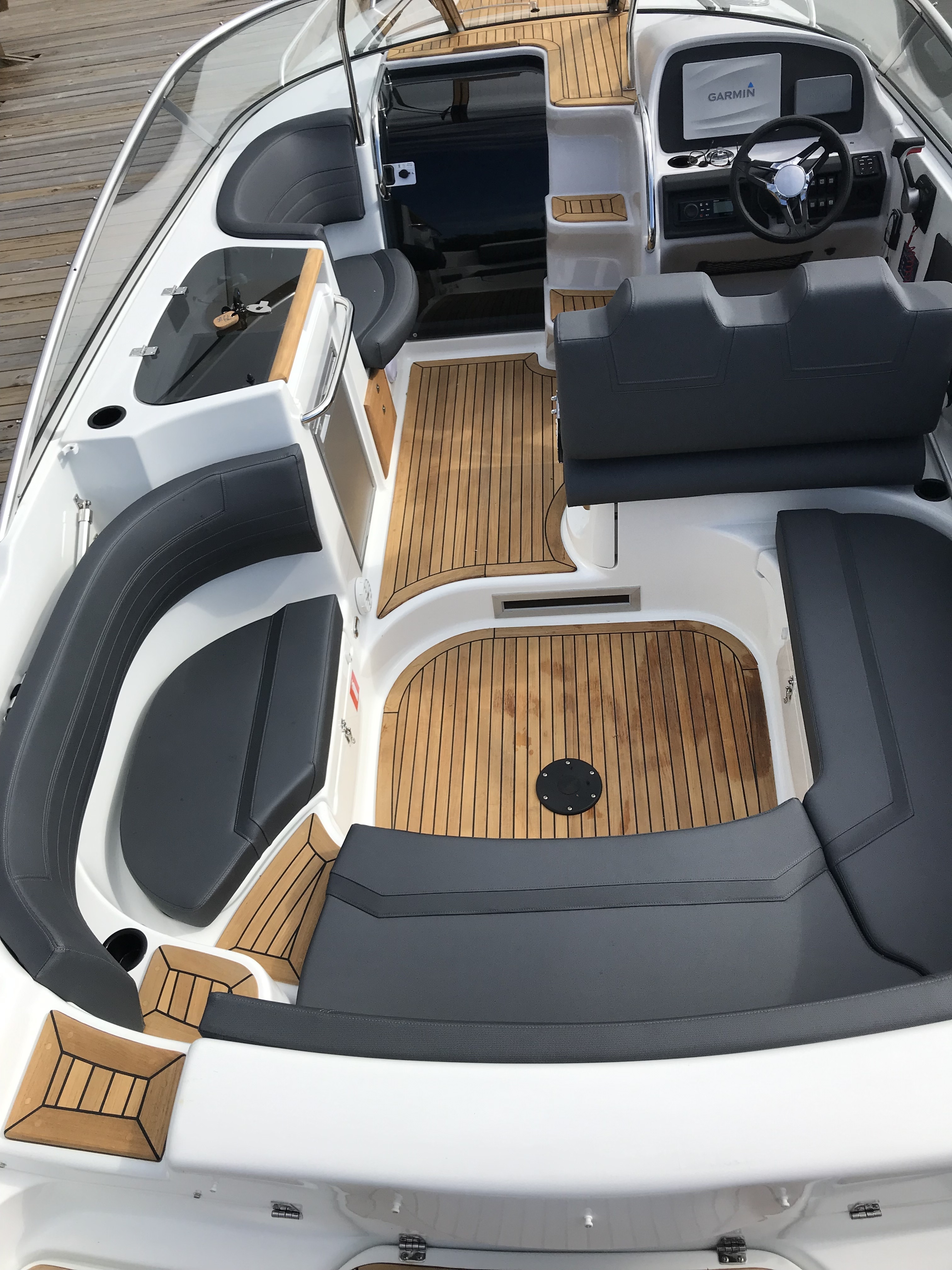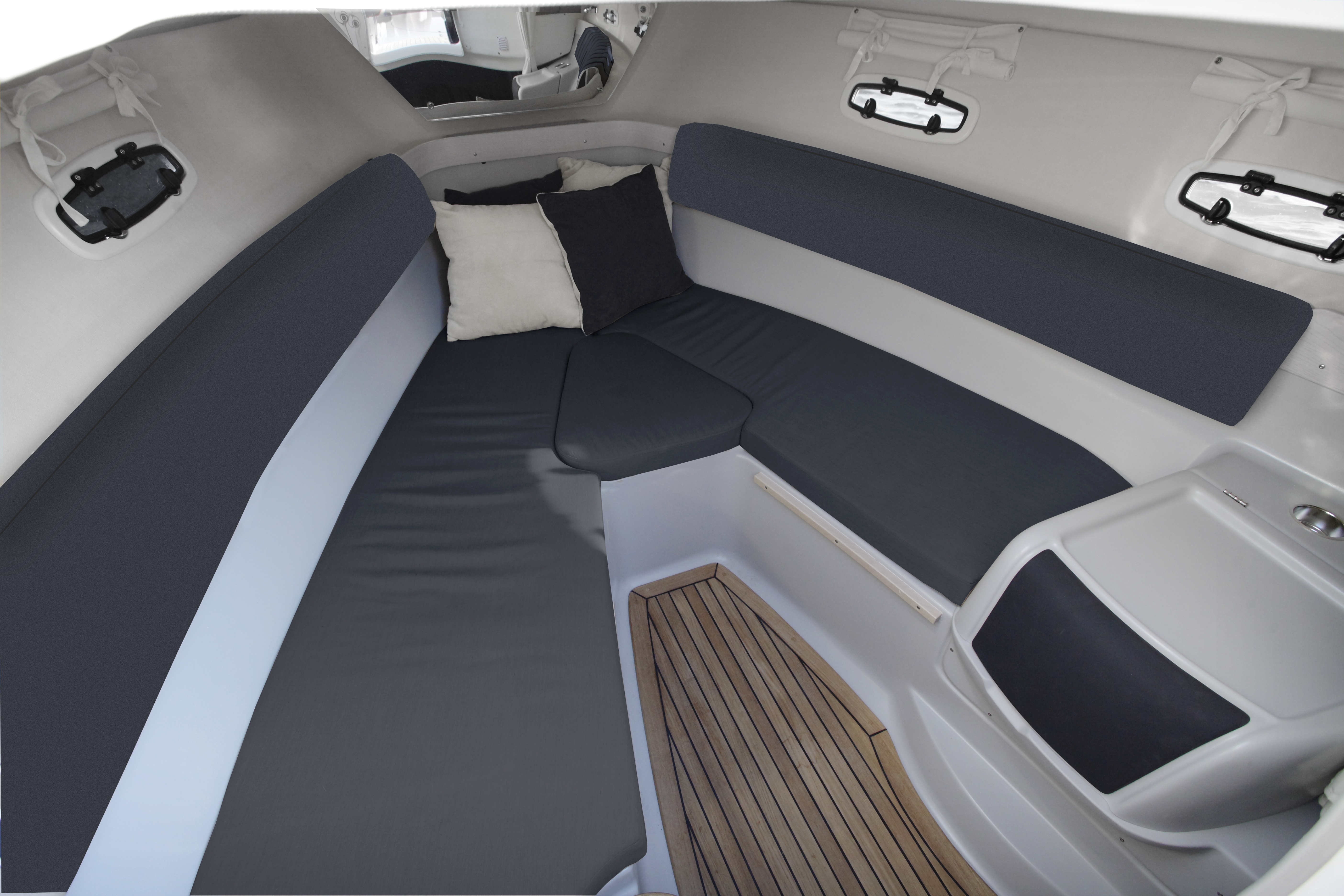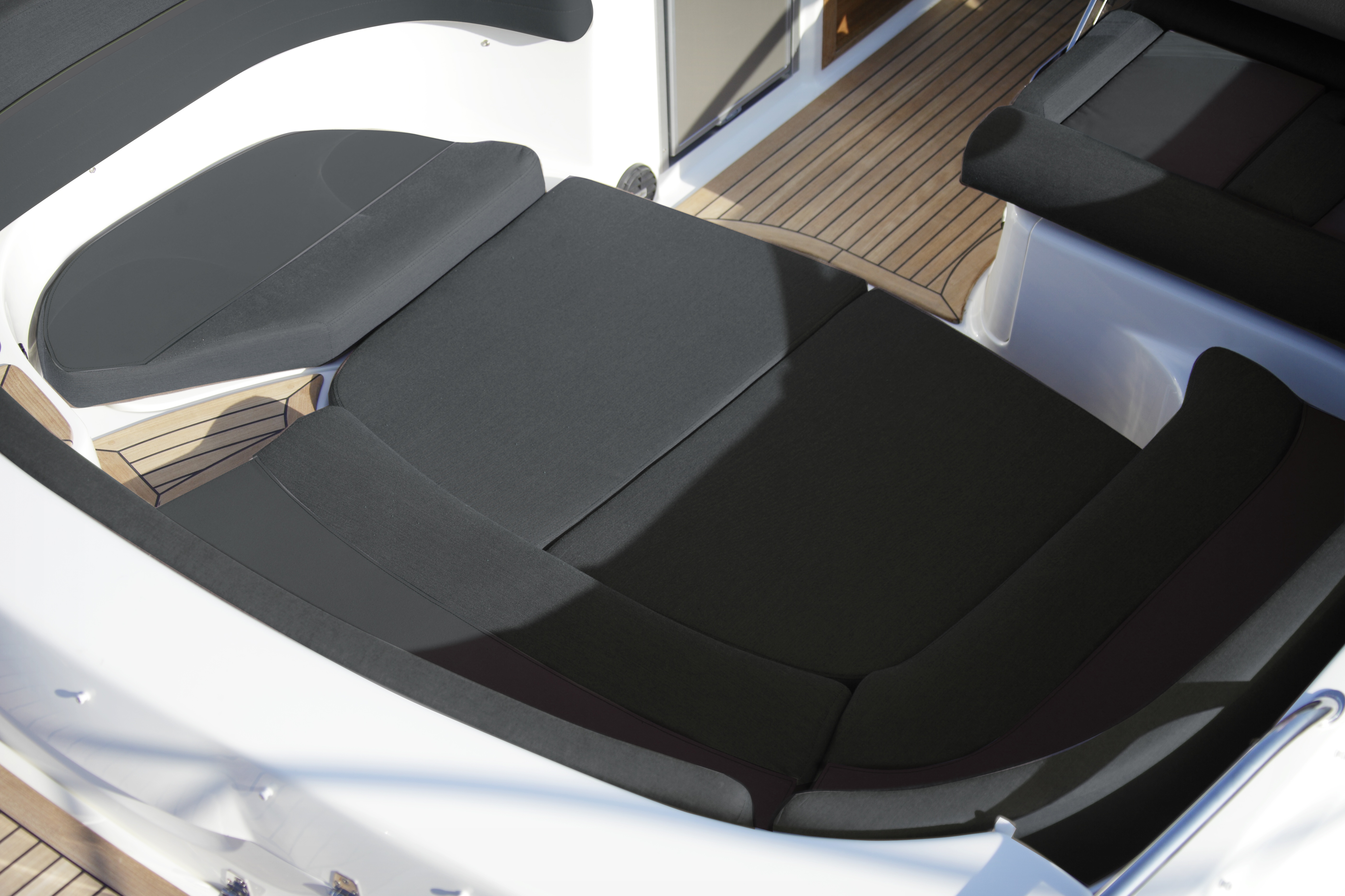Teak v kokpitu, na přední a zadní koupací plošině