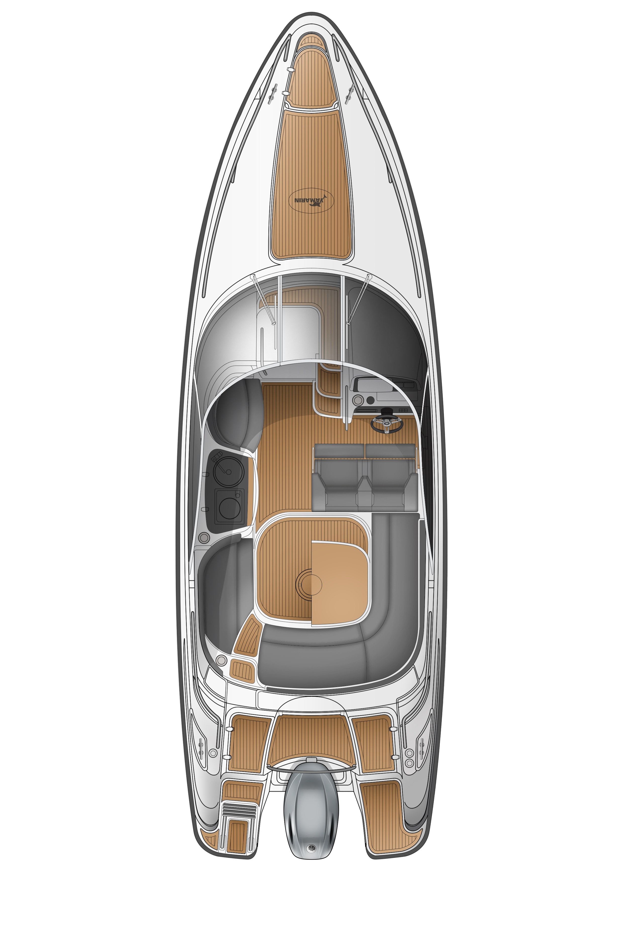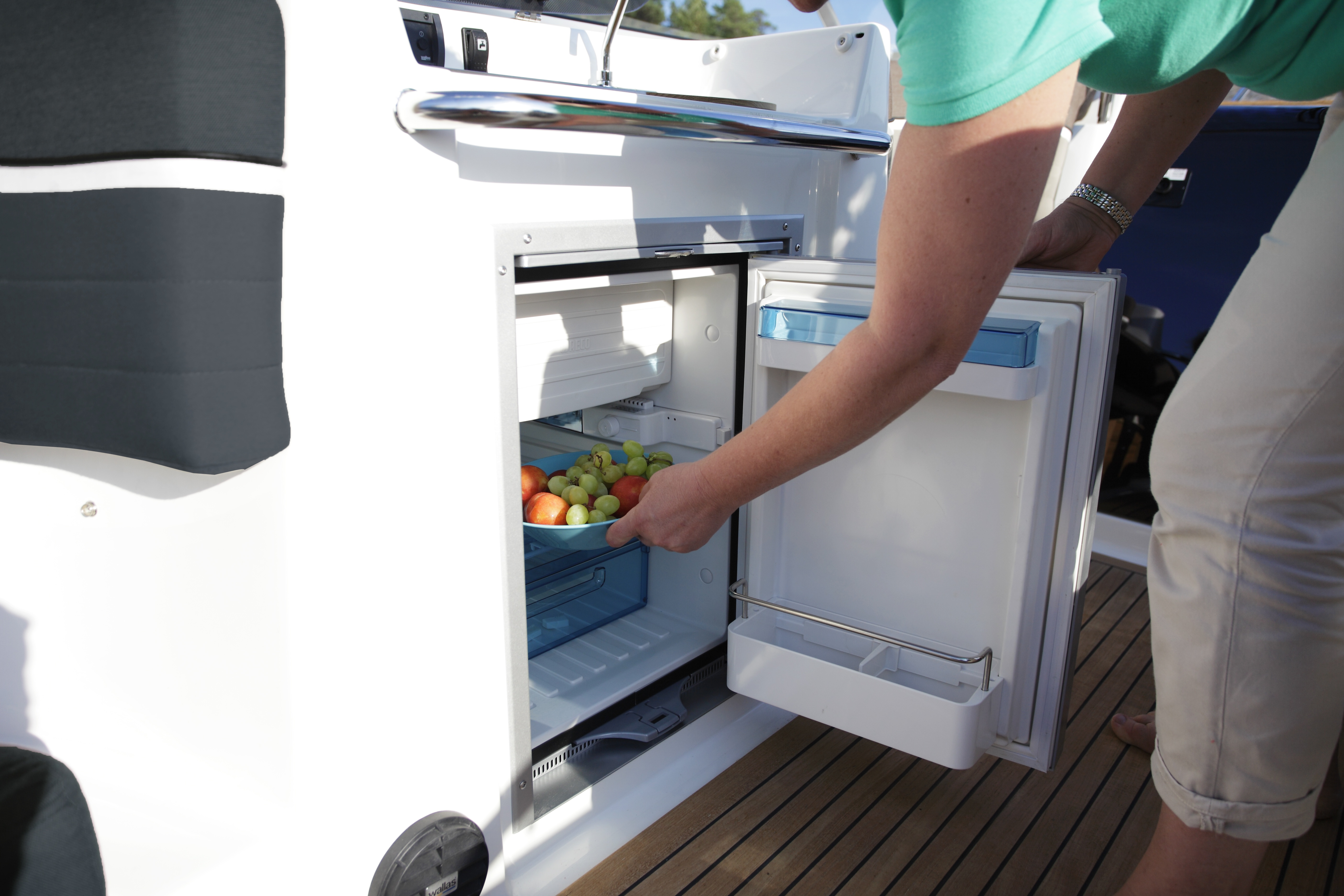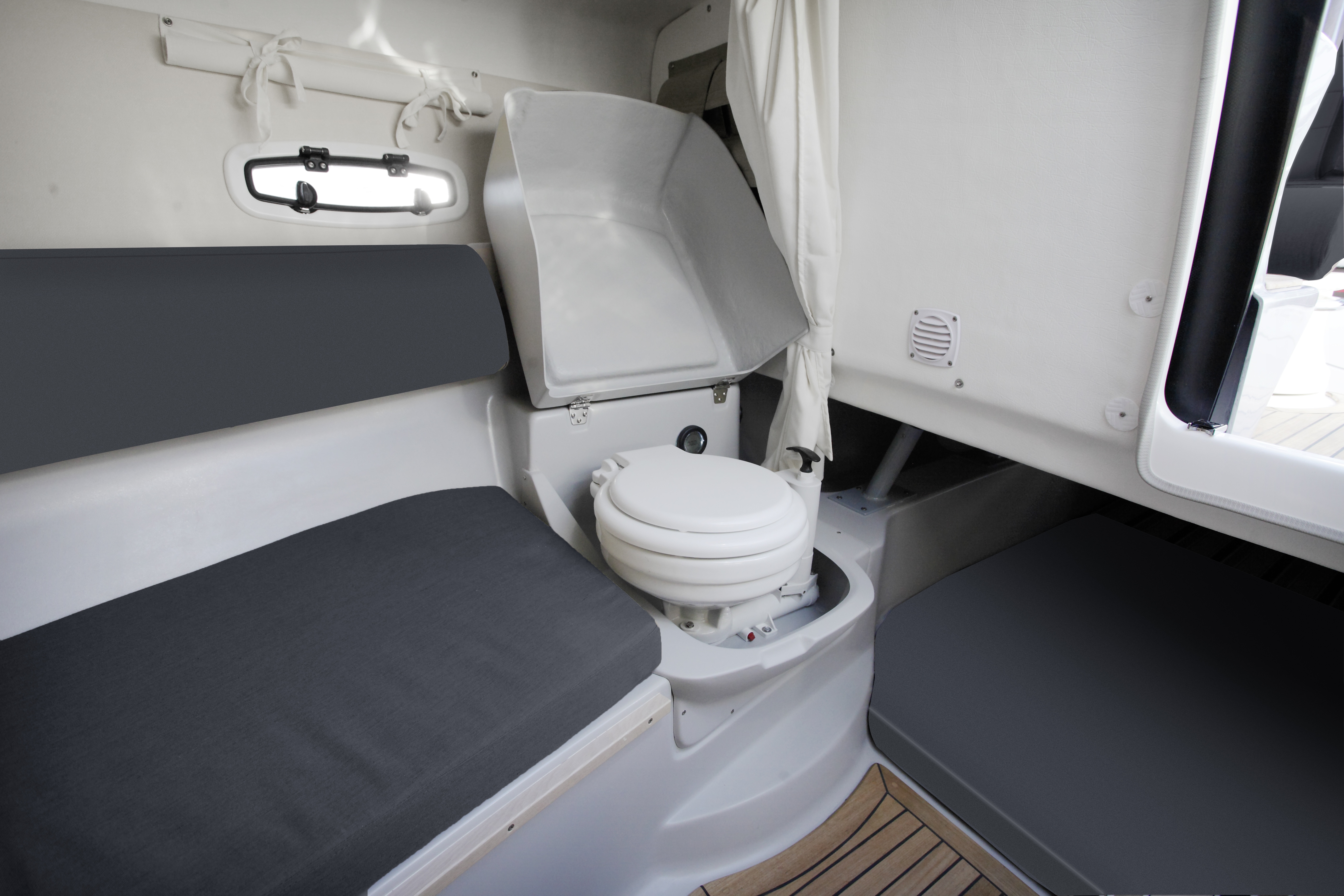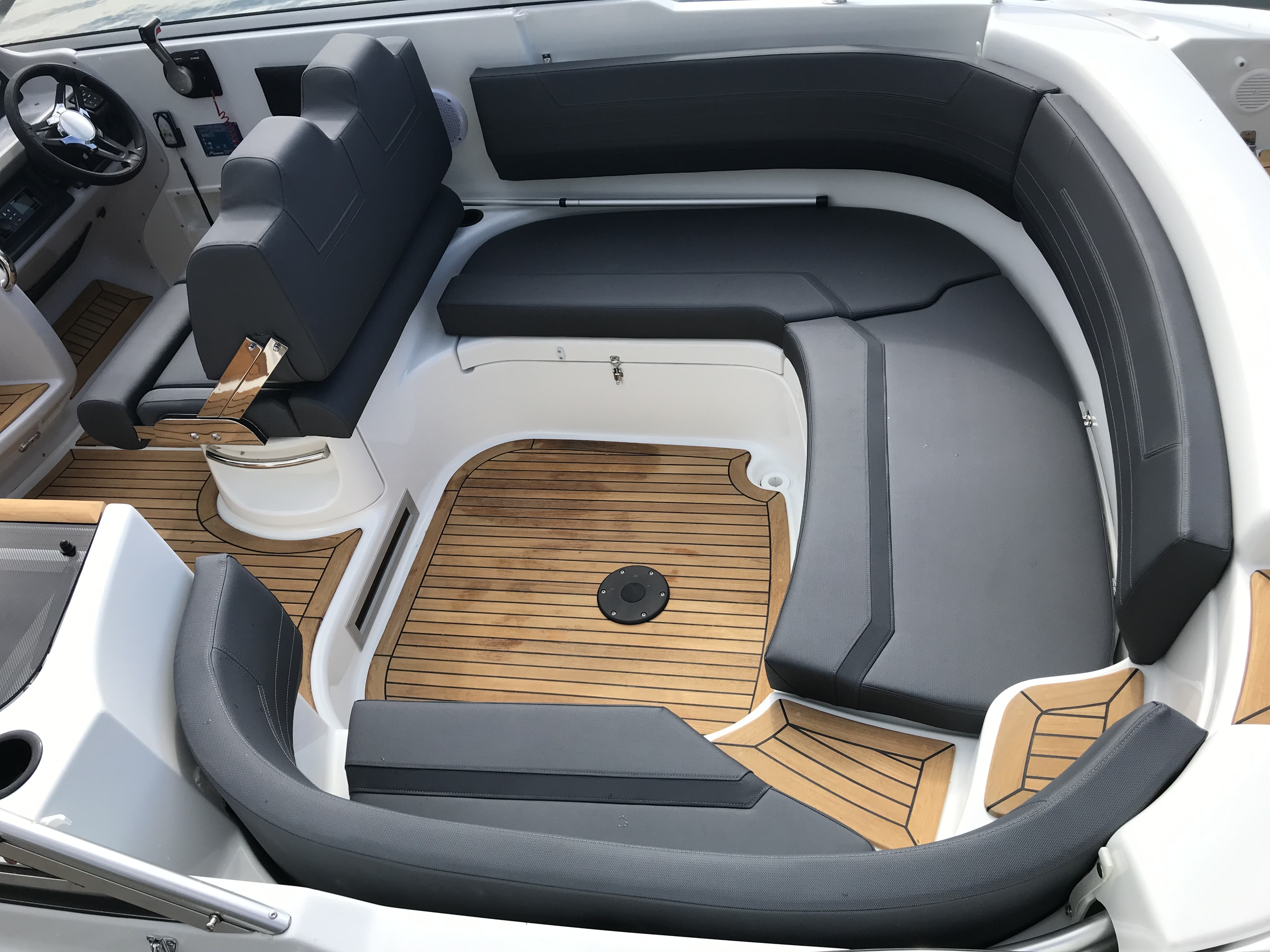 Teak v kokpitu, na přední a zadní koupací plošině