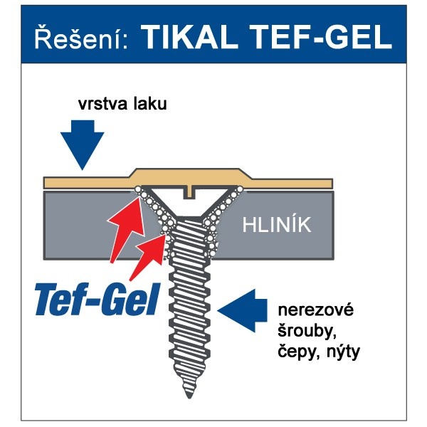 TIKAL TEF-GEL je antikorozní voděodolný gel (mazivo) na bázi polytetrafluoretylenu, který zabrání rozkvětu kovů a zastaví galvanickou korozi mezi rozdílnými ušlechtilými kovy. Dlouhodobě udrží závitová spojení. Ve srovnání s konkurenčními výrobky šetří životní prostředí, není jedovatý a neobsahuje chroman barnatý (karcinogenní látka).
